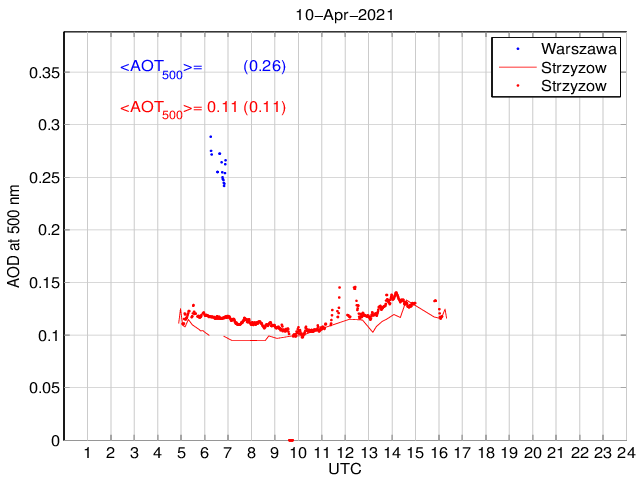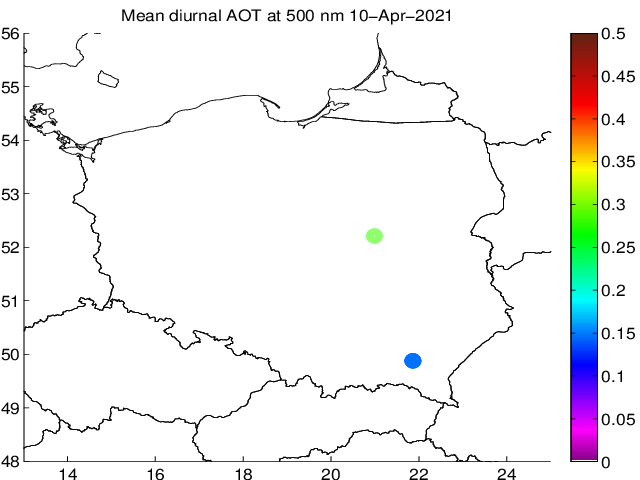 Przebieg dobowy grubości optycznej aerozolu dla długości fali 500 nm. Wielkość mierzona przy użyciu MFR-7 ShadowBand i fotometru CIMEL. Wartości podane na wykresie odnoszą się do średnich wartości za dany okres czasu.