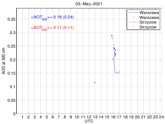 Przebieg dobowy grubości optycznej aerozolu dla długości fali 500 nm. Wielkość mierzona przy użyciu MFR-7 ShadowBand i fotometru CIMEL. Wartości podane na wykresie odnoszą się do średnich wartości za dany okres czasu.