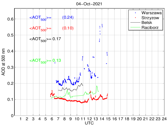 Przebieg dobowy grubości optycznej aerozolu dla długości fali 500 nm. Wielkość mierzona przy użyciu MFR-7 ShadowBand i fotometru CIMEL. Wartości podane na wykresie odnoszą się do średnich wartości za dany okres czasu.