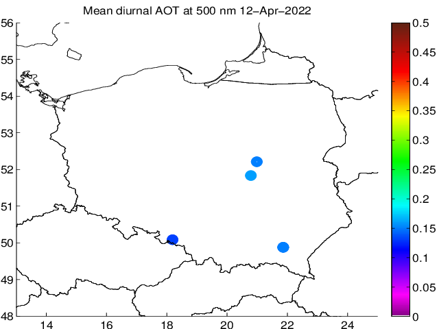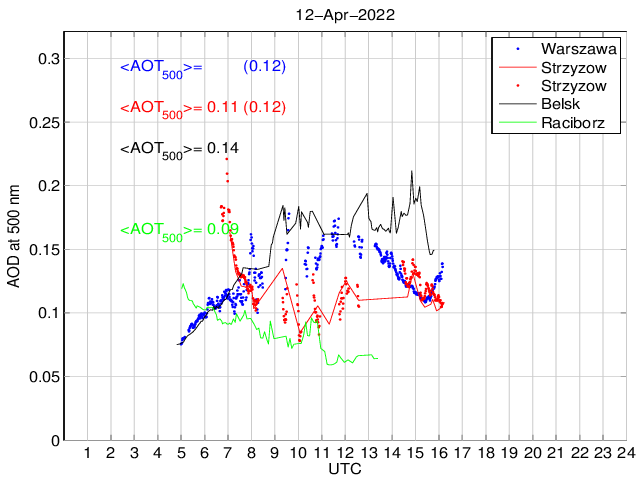 Przebieg dobowy grubości optycznej aerozolu dla długości fali 500 nm. Wielkość mierzona przy użyciu MFR-7 ShadowBand i fotometru CIMEL. Wartości podane na wykresie odnoszą się do średnich wartości za dany okres czasu.