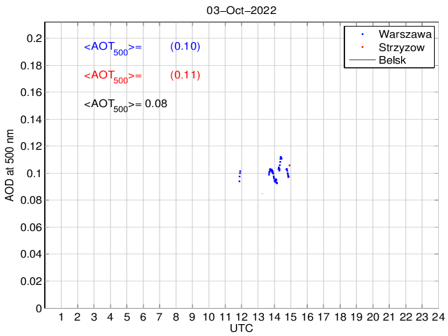 Przebieg dobowy grubości optycznej aerozolu dla długości fali 500 nm. Wielkość mierzona przy użyciu MFR-7 ShadowBand i fotometru CIMEL. Wartości podane na wykresie odnoszą się do średnich wartości za dany okres czasu.