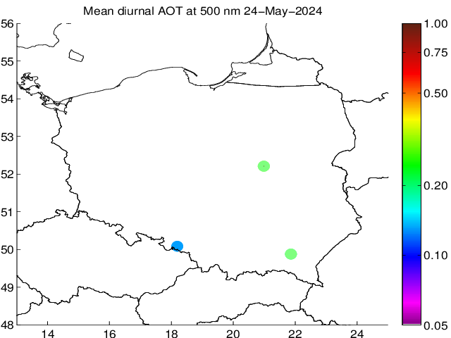 Przebieg dobowy grubości optycznej aerozolu dla długości fali 500 nm. Wielkość mierzona przy użyciu MFR-7 ShadowBand i fotometru CIMEL. Wartości podane na wykresie odnoszą się do średnich wartości za dany okres czasu.