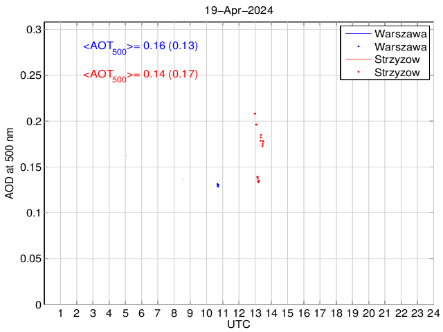 Diurnal cycle of aerosol optical depth (AOD) at 500 nm. AOD is measured by the Multi-Filter Rotating Shadowband Radiometer (MFR-7). The values shown in the figure refer to the average values for a given period of time.