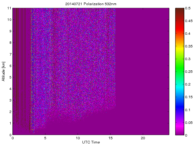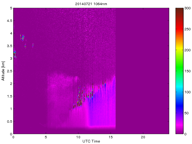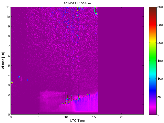 Wykres przedstwia sygnał z lidar ADR dla długości fali 1064 nm w zależności od czasu i wysokości nad powierzchnią ziemi. Signał został skorygowany na odleglość od przyrządu (range corrected signal). Sygnał jest poprawny od wysokości ok 550 metrów (powyżej wysokości kompresji geometrycznej. Kolorem czerownym i brązowym widoczne są na mapie chmury.