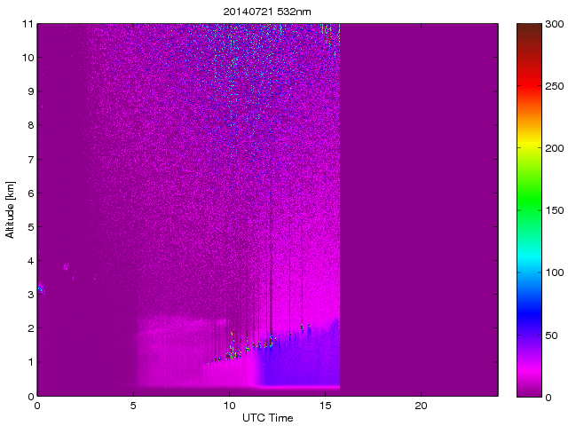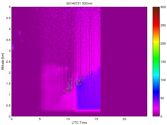 Wykres przedstwia sygnał z lidaru ADR dla długości fali 532 nm w zależności od czasu i wysokości nad powierzchnią ziemi. Signał został skorygowany na odleglość od przyrządu (range corrected signal).