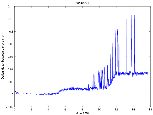 Dobowy przebieg grubości optycznej pomiędzy wysokością 0.5 a 6 km dla długosci fali 1064 nm