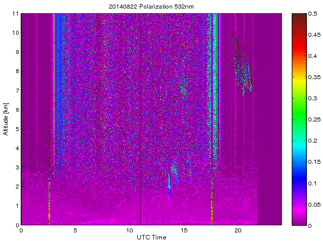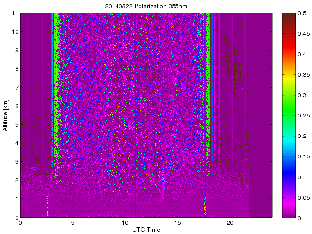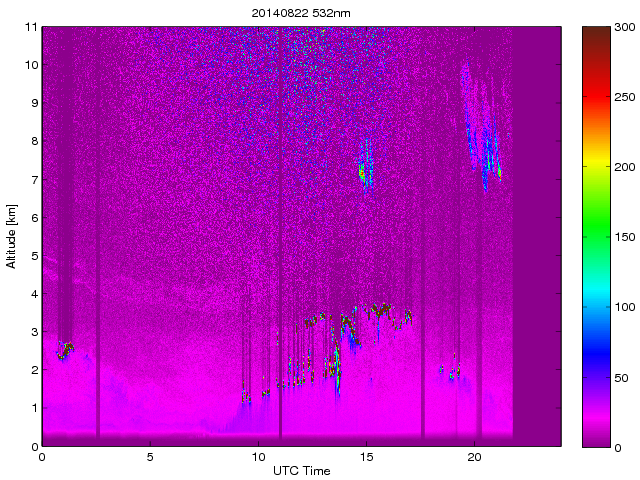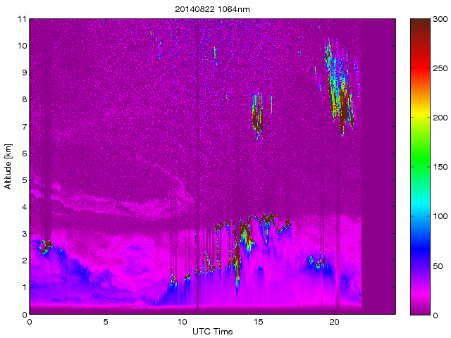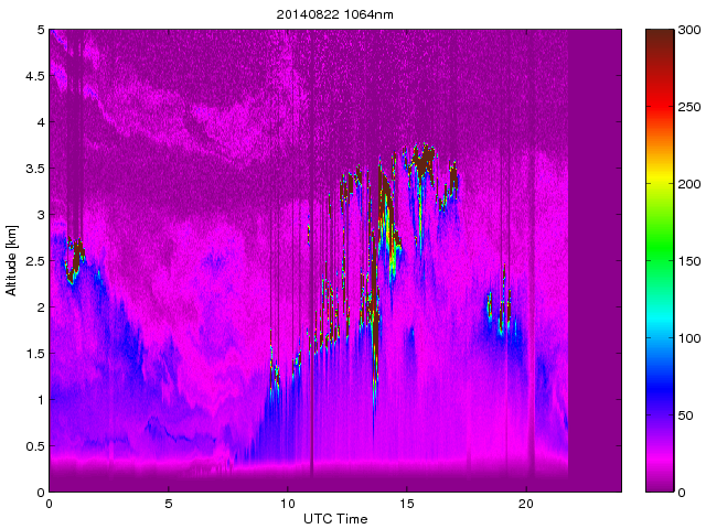 Wykres przedstwia sygnał z lidar ADR dla długości fali 1064 nm w zależności od czasu i wysokości nad powierzchnią ziemi. Signał został skorygowany na odleglość od przyrządu (range corrected signal). Sygnał jest poprawny od wysokości ok 550 metrów (powyżej wysokości kompresji geometrycznej. Kolorem czerownym i brązowym widoczne są na mapie chmury.