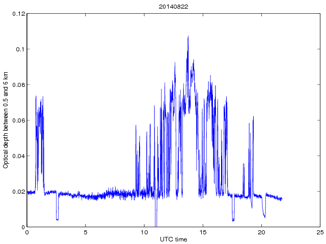 Dobowy przebieg grubości optycznej pomiędzy wysokością 0.5 a 6 km dla długosci fali 1064 nm