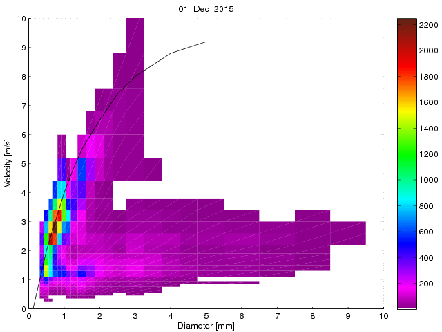 Średnie dobowe widmo wielkości i prędkości opadania hydrometeorów na podstawie pomiarów Disdrometrem OTT Parsivel.