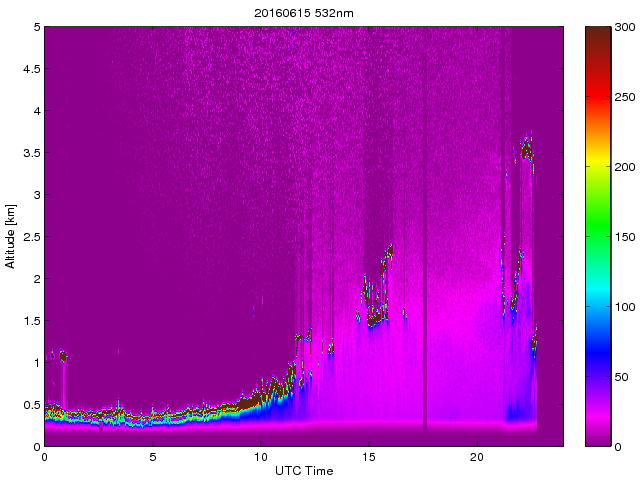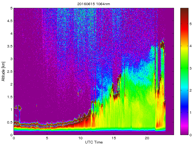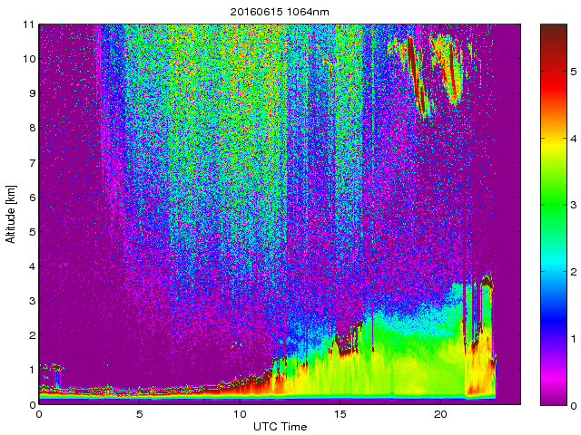 Wykres przedstwia sygnał z lidar ADR dla długości fali 1064 nm w zależności od czasu i wysokości nad powierzchnią ziemi. Signał został skorygowany na odleglość od przyrządu (range corrected signal). Sygnał jest poprawny od wysokości ok 550 metrów (powyżej wysokości kompresji geometrycznej. Kolorem czerownym i brązowym widoczne są na mapie chmury.