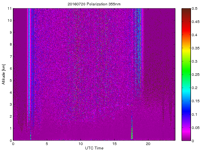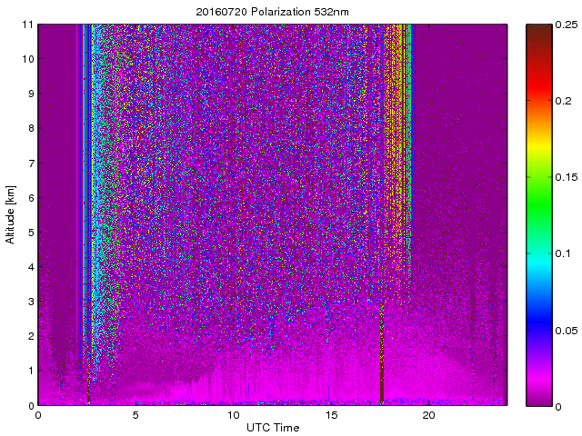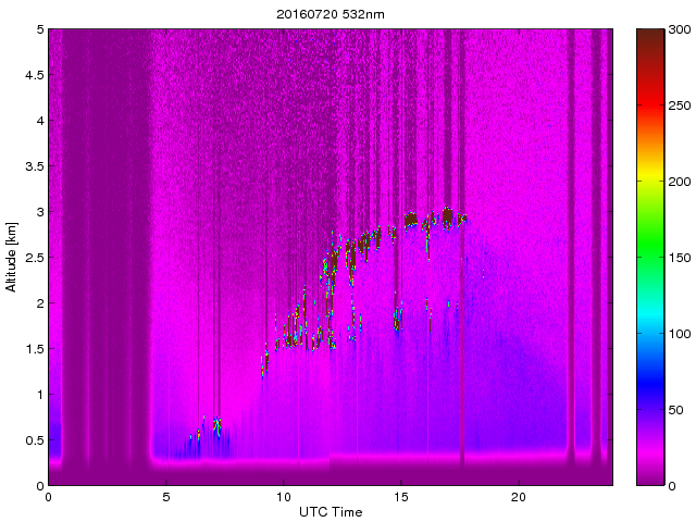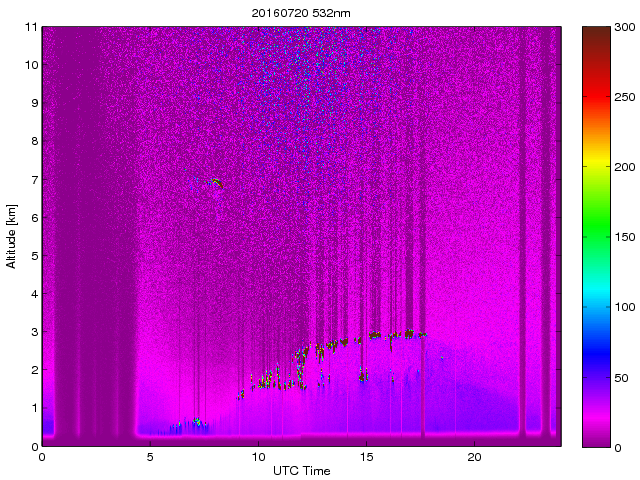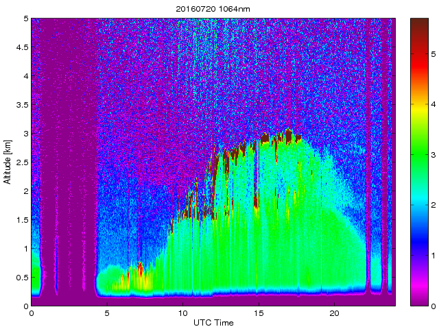 Wykres przedstwia sygnał z lidar ADR dla długości fali 1064 nm w zależności od czasu i wysokości nad powierzchnią ziemi. Signał został skorygowany na odleglość od przyrządu (range corrected signal). Sygnał jest poprawny od wysokości ok 550 metrów (powyżej wysokości kompresji geometrycznej. Kolorem czerownym i brązowym widoczne są na mapie chmury.