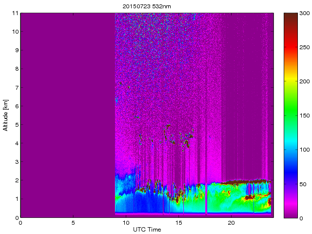 Wykres przedstwia sygnał z lidaru ADR dla długości fali 532 nm w zależności od czasu i wysokości nad powierzchnią ziemi. Signał został skorygowany na odleglość od przyrządu (range corrected signal).