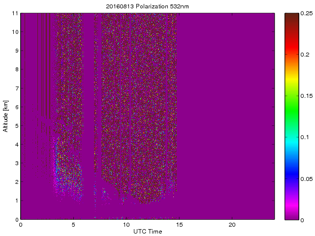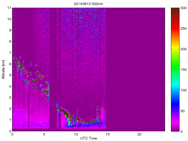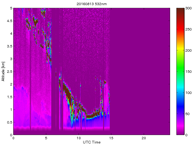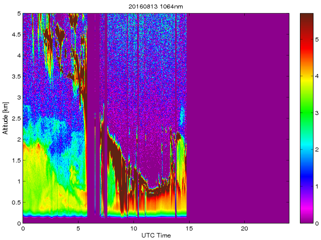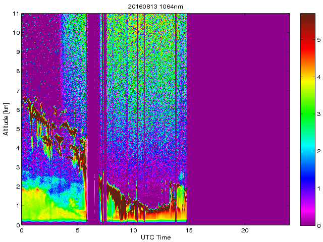 Wykres przedstwia sygnał z lidar ADR dla długości fali 1064 nm w zależności od czasu i wysokości nad powierzchnią ziemi. Signał został skorygowany na odleglość od przyrządu (range corrected signal). Sygnał jest poprawny od wysokości ok 550 metrów (powyżej wysokości kompresji geometrycznej. Kolorem czerownym i brązowym widoczne są na mapie chmury.