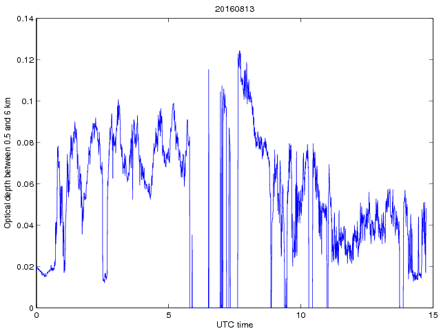 Dobowy przebieg grubości optycznej pomiędzy wysokością 0.5 a 6 km dla długosci fali 1064 nm