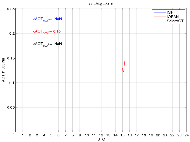 Przebieg dobowy grubości optycznej aerozolu dla długości fali 500 nm. Wielkość mierzona przy użyciu MFR-7 ShadowBand i fotometru CIMEL. Wartości podane na wykresie odnoszą się do średnich wartości za dany okres czasu.