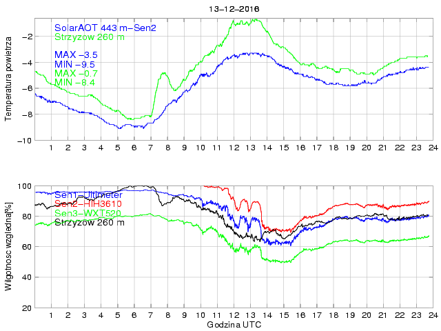 Przebieg dobowy temperatury powietrza na stacji SolarAOT (443 m) i dolnej stacji w Strzyżowie (260 m) oraz wilgotności powietrza mierzonej na stacji SolarAOT dwoma różnymi czujnikami. Różnica temperatur pomiędzy dolną i górną stacją umożliwia określenie stratyfikacji najniższej warstwy granicznej.