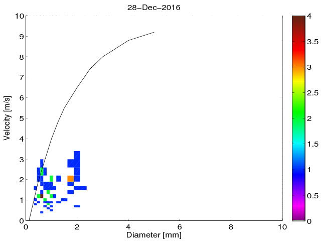 Średnie dobowe widmo wielkości i prędkości opadania hydrometeorów na podstawie pomiarów Disdrometrem OTT Parsivel.