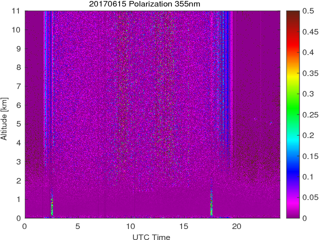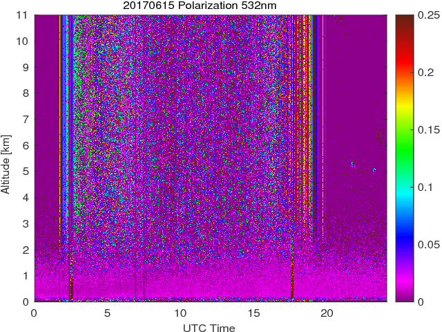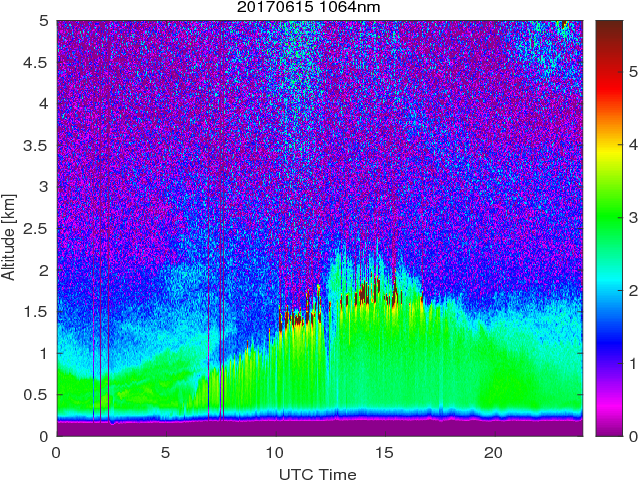 Wykres przedstwia sygnał z lidar ADR dla długości fali 1064 nm w zależności od czasu i wysokości nad powierzchnią ziemi. Signał został skorygowany na odleglość od przyrządu (range corrected signal). Sygnał jest poprawny od wysokości ok 550 metrów (powyżej wysokości kompresji geometrycznej. Kolorem czerownym i brązowym widoczne są na mapie chmury.