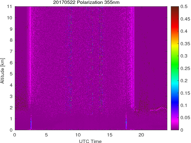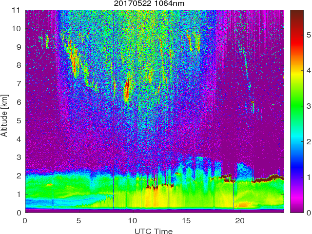Wykres przedstwia sygnał z lidar ADR dla długości fali 1064 nm w zależności od czasu i wysokości nad powierzchnią ziemi. Signał został skorygowany na odleglość od przyrządu (range corrected signal). Sygnał jest poprawny od wysokości ok 550 metrów (powyżej wysokości kompresji geometrycznej. Kolorem czerownym i brązowym widoczne są na mapie chmury.