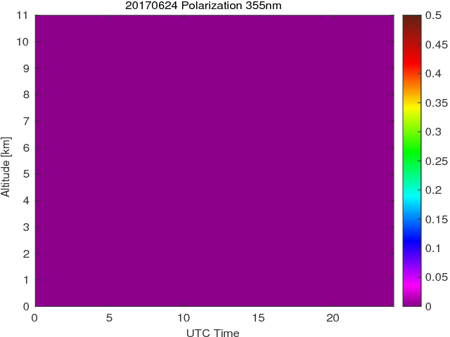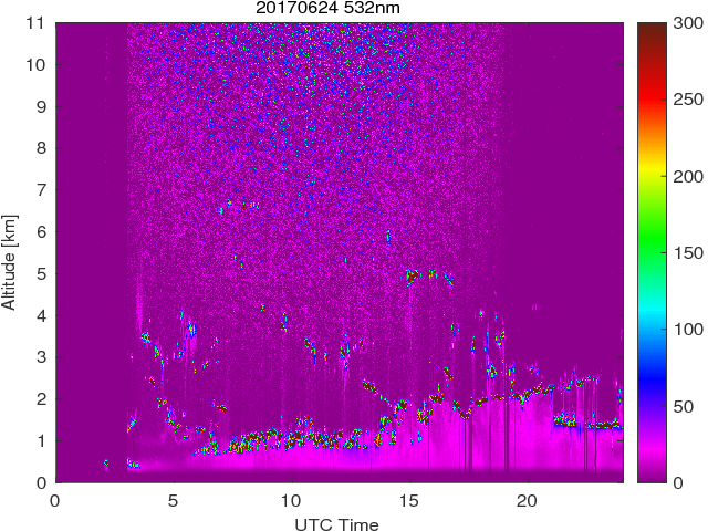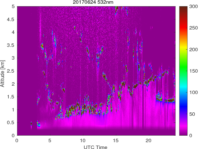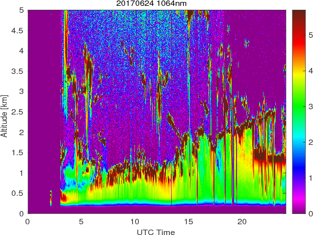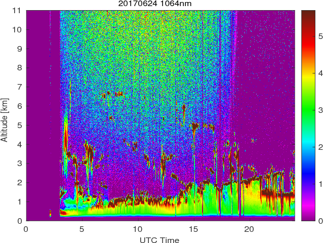 Wykres przedstwia sygnał z lidar ADR dla długości fali 1064 nm w zależności od czasu i wysokości nad powierzchnią ziemi. Signał został skorygowany na odleglość od przyrządu (range corrected signal). Sygnał jest poprawny od wysokości ok 550 metrów (powyżej wysokości kompresji geometrycznej. Kolorem czerownym i brązowym widoczne są na mapie chmury.
