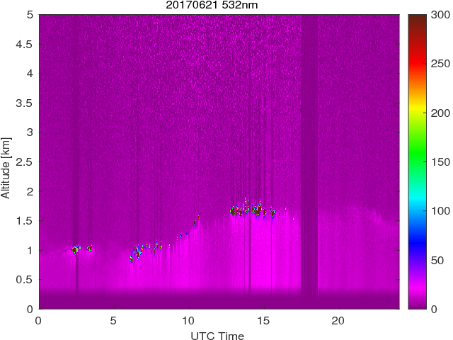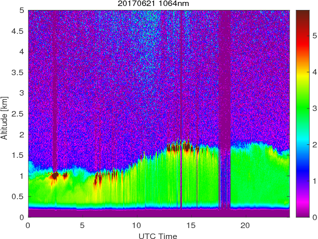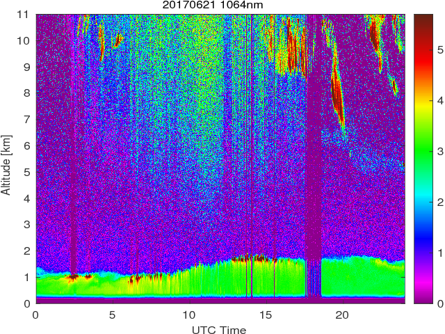 Wykres przedstwia sygnał z lidar ADR dla długości fali 1064 nm w zależności od czasu i wysokości nad powierzchnią ziemi. Signał został skorygowany na odleglość od przyrządu (range corrected signal). Sygnał jest poprawny od wysokości ok 550 metrów (powyżej wysokości kompresji geometrycznej. Kolorem czerownym i brązowym widoczne są na mapie chmury.