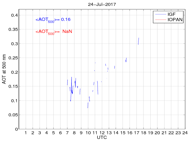 Przebieg dobowy grubości optycznej aerozolu dla długości fali 500 nm. Wielkość mierzona przy użyciu MFR-7 ShadowBand i fotometru CIMEL. Wartości podane na wykresie odnoszą się do średnich wartości za dany okres czasu.