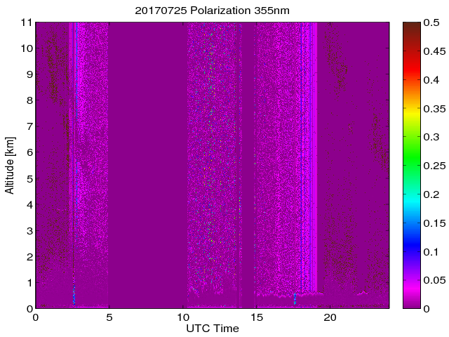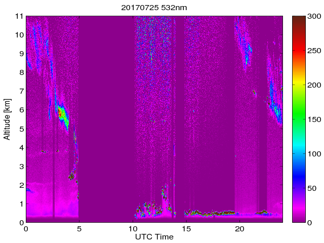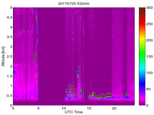 Wykres przedstwia sygnał z lidar ADR dla długości fali 1064 nm w zależności od czasu i wysokości nad powierzchnią ziemi. Signał został skorygowany na odleglość od przyrządu (range corrected signal). Sygnał jest poprawny od wysokości ok 550 metrów (powyżej wysokości kompresji geometrycznej. Kolorem czerownym i brązowym widoczne są na mapie chmury.