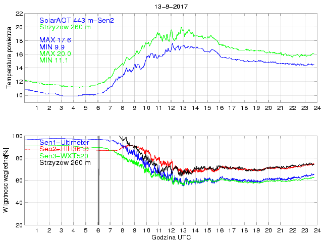 Przebieg dobowy temperatury powietrza na stacji SolarAOT (443 m) i dolnej stacji w Strzyżowie (260 m) oraz wilgotności powietrza mierzonej na stacji SolarAOT dwoma różnymi czujnikami. Różnica temperatur pomiędzy dolną i górną stacją umożliwia określenie stratyfikacji najniższej warstwy granicznej.