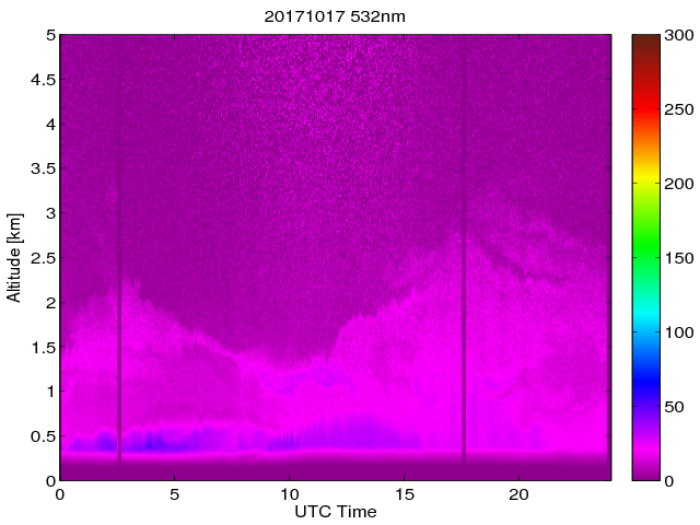 Wykres przedstwia sygnał z lidar ADR dla długości fali 1064 nm w zależności od czasu i wysokości nad powierzchnią ziemi. Signał został skorygowany na odleglość od przyrządu (range corrected signal). Sygnał jest poprawny od wysokości ok 550 metrów (powyżej wysokości kompresji geometrycznej. Kolorem czerownym i brązowym widoczne są na mapie chmury.