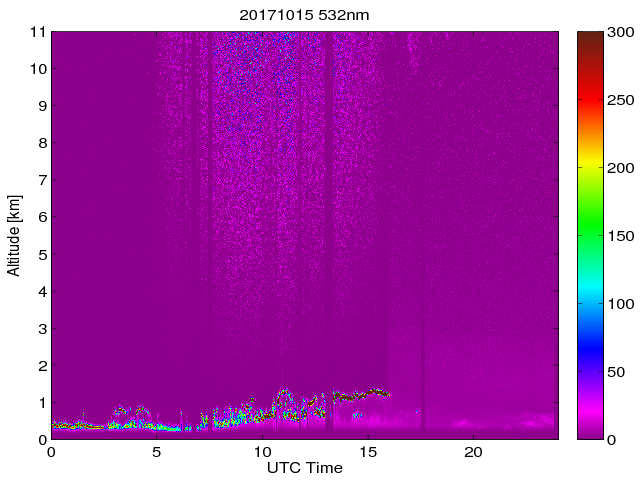 Wykres przedstwia sygnał z lidar ADR dla długości fali 1064 nm w zależności od czasu i wysokości nad powierzchnią ziemi. Signał został skorygowany na odleglość od przyrządu (range corrected signal). Sygnał jest poprawny od wysokości ok 550 metrów (powyżej wysokości kompresji geometrycznej. Kolorem czerownym i brązowym widoczne są na mapie chmury.