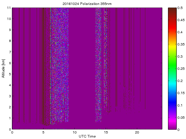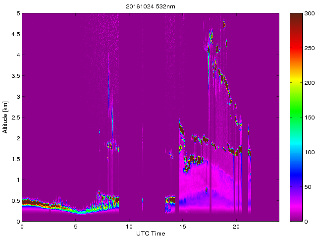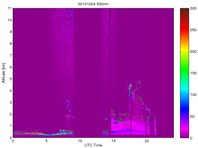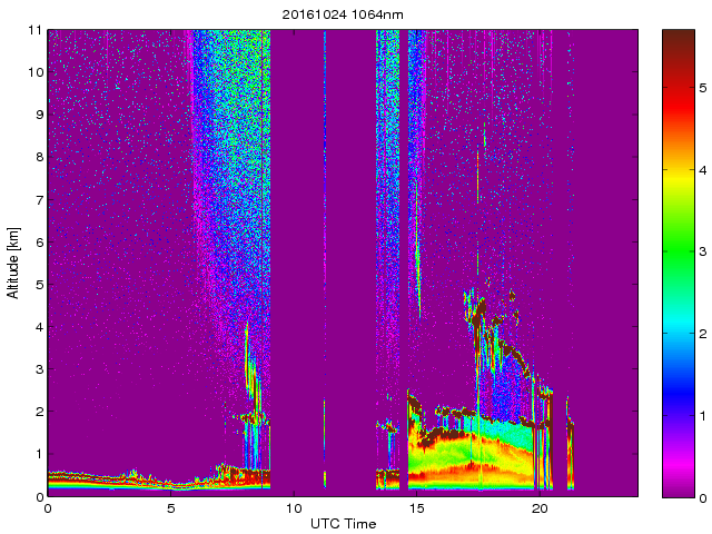 Wykres przedstwia sygnał z lidar ADR dla długości fali 1064 nm w zależności od czasu i wysokości nad powierzchnią ziemi. Signał został skorygowany na odleglość od przyrządu (range corrected signal). Sygnał jest poprawny od wysokości ok 550 metrów (powyżej wysokości kompresji geometrycznej. Kolorem czerownym i brązowym widoczne są na mapie chmury.