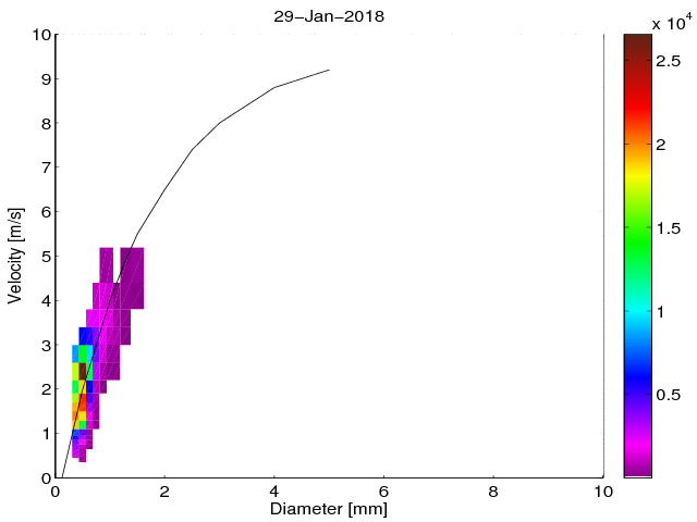 Średnie dobowe widmo wielkości i prędkości opadania hydrometeorów na podstawie pomiarów Disdrometrem OTT Parsivel.