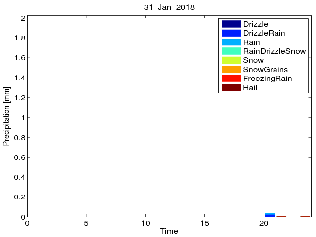 Przebieg dobowy sumy opadu z podziałem na typy hydrometeorów na podstawie pomiarów Disdrometrem OTT Parsivel.
