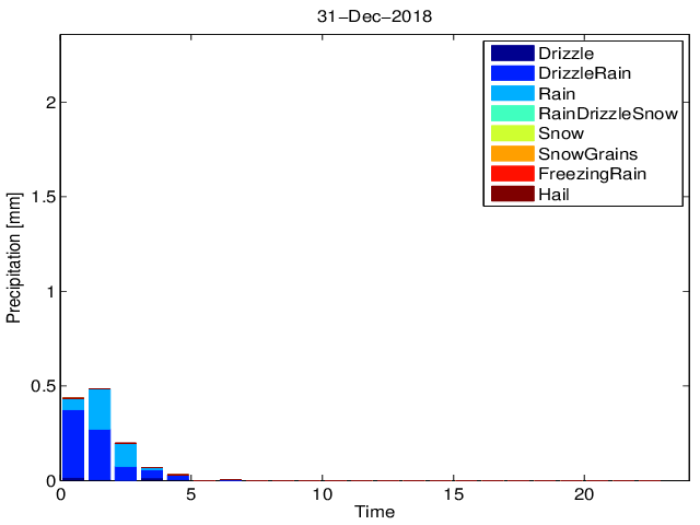 Przebieg dobowy sumy opadu z podziałem na typy hydrometeorów na podstawie pomiarów Disdrometrem OTT Parsivel.