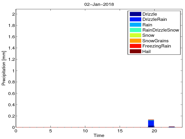 Przebieg dobowy sumy opadu z podziałem na typy hydrometeorów na podstawie pomiarów Disdrometrem OTT Parsivel.