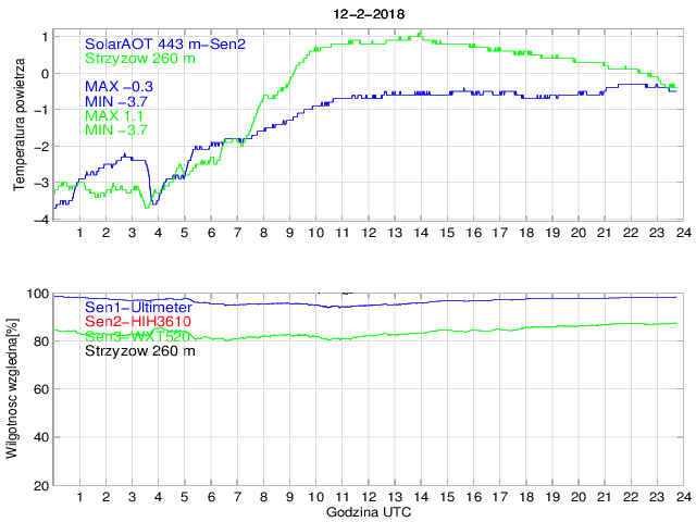 Przebieg dobowy temperatury powietrza na stacji SolarAOT (443 m) i dolnej stacji w Strzyżowie (260 m) oraz wilgotności powietrza mierzonej na stacji SolarAOT dwoma różnymi czujnikami. Różnica temperatur pomiędzy dolną i górną stacją umożliwia określenie stratyfikacji najniższej warstwy granicznej.
