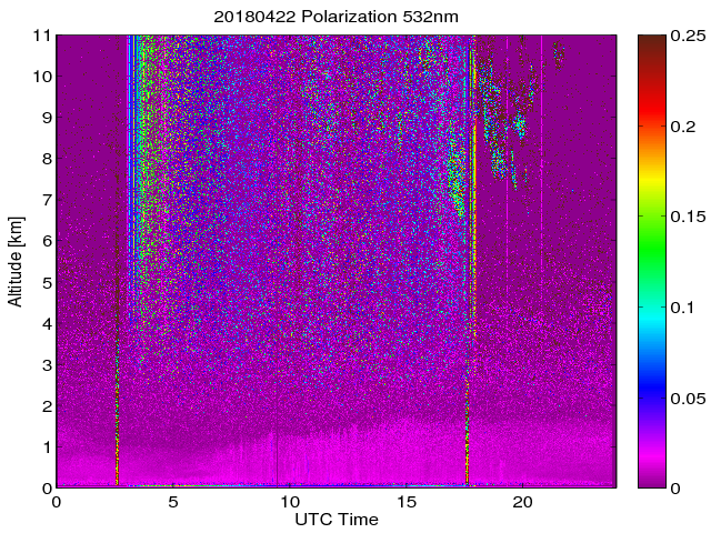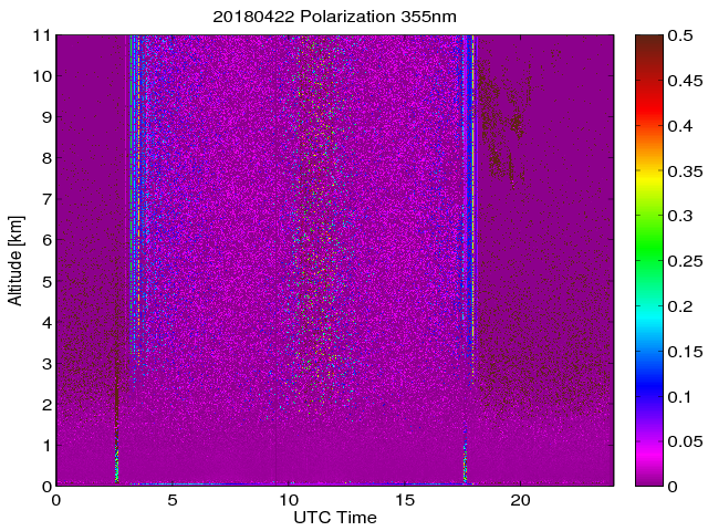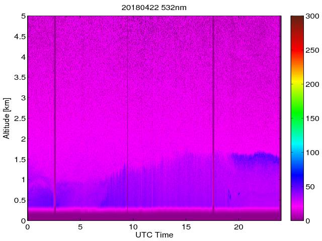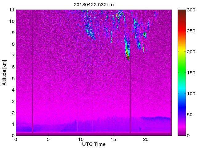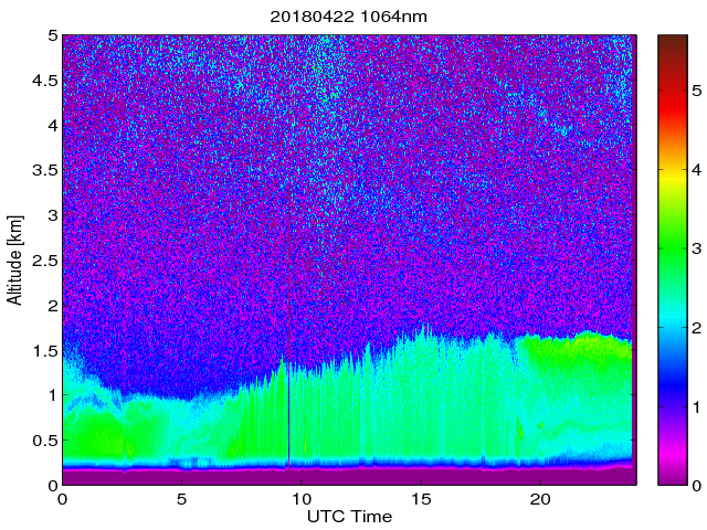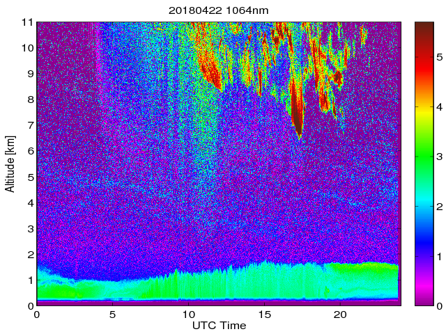 Wykres przedstwia sygnał z lidar ADR dla długości fali 1064 nm w zależności od czasu i wysokości nad powierzchnią ziemi. Signał został skorygowany na odleglość od przyrządu (range corrected signal). Sygnał jest poprawny od wysokości ok 550 metrów (powyżej wysokości kompresji geometrycznej. Kolorem czerownym i brązowym widoczne są na mapie chmury.