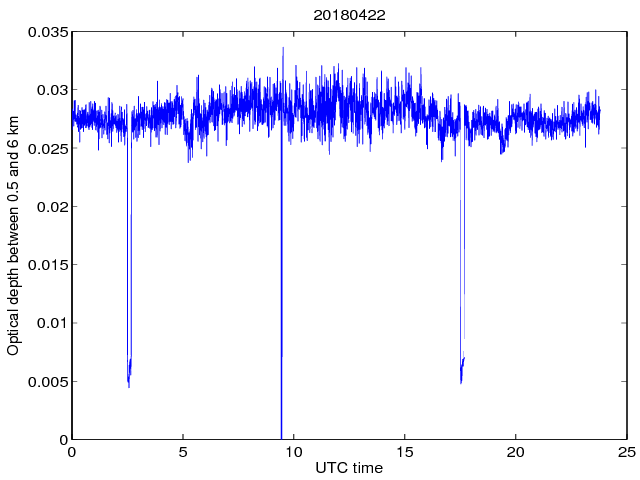 Dobowy przebieg grubości optycznej pomiędzy wysokością 0.5 a 6 km dla długosci fali 1064 nm