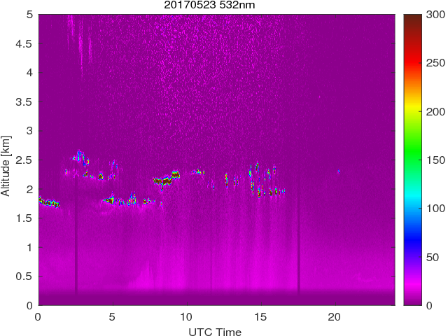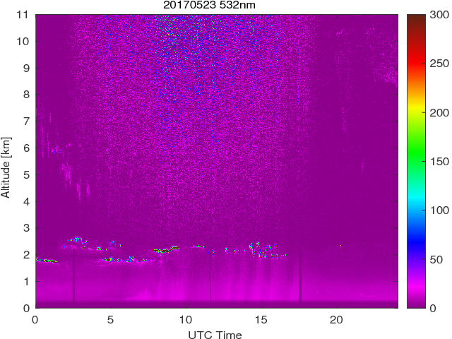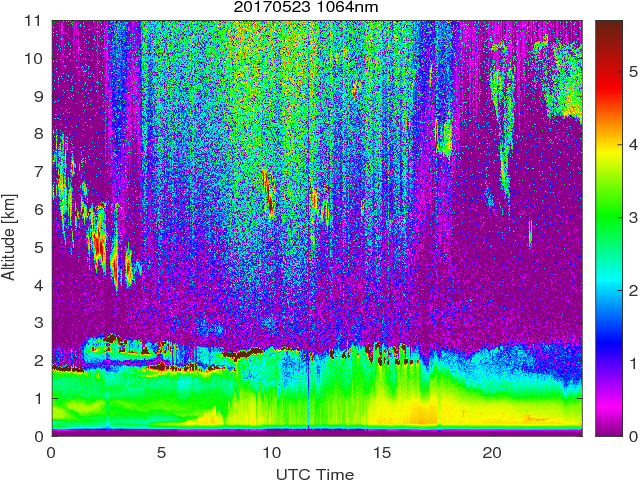 Wykres przedstwia sygnał z lidar ADR dla długości fali 1064 nm w zależności od czasu i wysokości nad powierzchnią ziemi. Signał został skorygowany na odleglość od przyrządu (range corrected signal). Sygnał jest poprawny od wysokości ok 550 metrów (powyżej wysokości kompresji geometrycznej. Kolorem czerownym i brązowym widoczne są na mapie chmury.