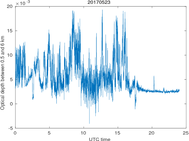 Dobowy przebieg grubości optycznej pomiędzy wysokością 0.5 a 6 km dla długosci fali 1064 nm