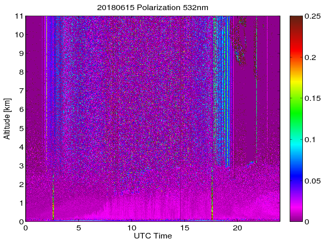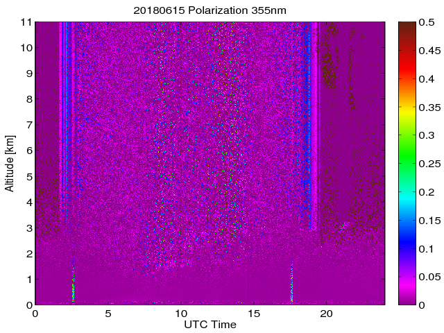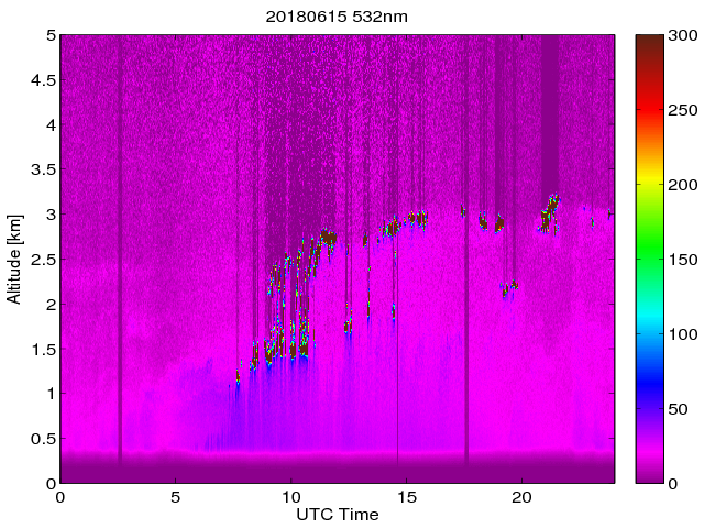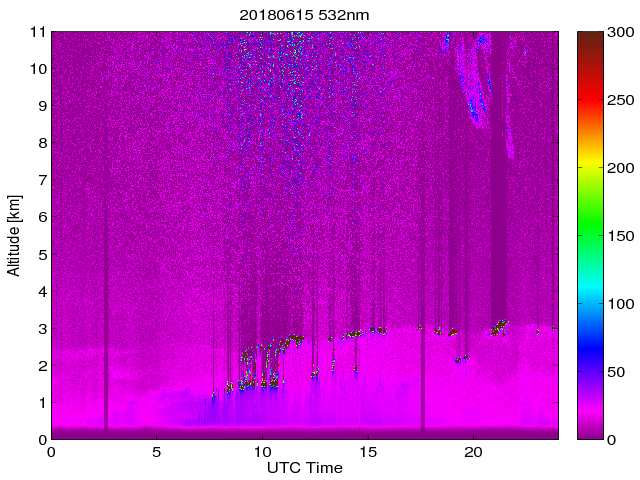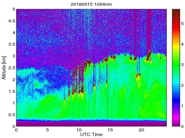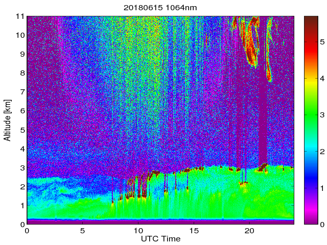 Wykres przedstwia sygnał z lidar ADR dla długości fali 1064 nm w zależności od czasu i wysokości nad powierzchnią ziemi. Signał został skorygowany na odleglość od przyrządu (range corrected signal). Sygnał jest poprawny od wysokości ok 550 metrów (powyżej wysokości kompresji geometrycznej. Kolorem czerownym i brązowym widoczne są na mapie chmury.