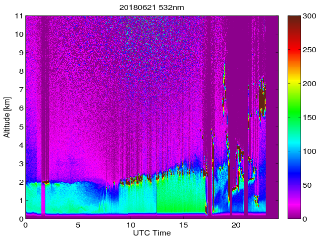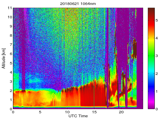 Wykres przedstwia sygnał z lidar ADR dla długości fali 1064 nm w zależności od czasu i wysokości nad powierzchnią ziemi. Signał został skorygowany na odleglość od przyrządu (range corrected signal). Sygnał jest poprawny od wysokości ok 550 metrów (powyżej wysokości kompresji geometrycznej. Kolorem czerownym i brązowym widoczne są na mapie chmury.