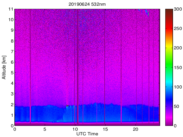Wykres przedstwia sygnał z lidar ADR dla długości fali 1064 nm w zależności od czasu i wysokości nad powierzchnią ziemi. Signał został skorygowany na odleglość od przyrządu (range corrected signal). Sygnał jest poprawny od wysokości ok 550 metrów (powyżej wysokości kompresji geometrycznej. Kolorem czerownym i brązowym widoczne są na mapie chmury.