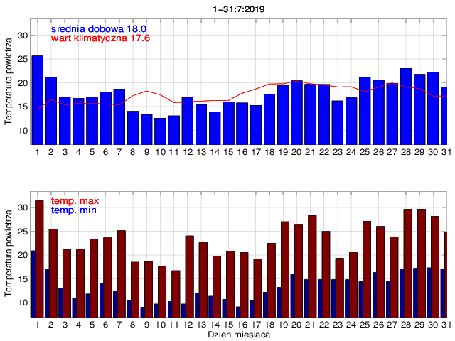 Przebieg miesięczny temperatury powietrza na stacji SolarAOT (443 m) i dolnej stacji w Strzyżowie (260 m) oraz wilgotności powietrza mierzonej na stacji SolarAOT dwoma różnymi czujnikami. Różnica temperatur pomiędzy dolną i górną stacją umożliwia określenie stratyfikacji najniższej warstwy granicznej.