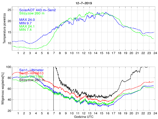 Przebieg dobowy temperatury powietrza na stacji SolarAOT (443 m) i dolnej stacji w Strzyżowie (260 m) oraz wilgotności powietrza mierzonej na stacji SolarAOT dwoma różnymi czujnikami. Różnica temperatur pomiędzy dolną i górną stacją umożliwia określenie stratyfikacji najniższej warstwy granicznej.