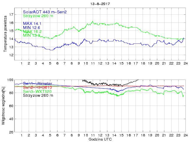 Przebieg dobowy temperatury powietrza na stacji SolarAOT (443 m) i dolnej stacji w Strzyżowie (260 m) oraz wilgotności powietrza mierzonej na stacji SolarAOT dwoma różnymi czujnikami. Różnica temperatur pomiędzy dolną i górną stacją umożliwia określenie stratyfikacji najniższej warstwy granicznej.