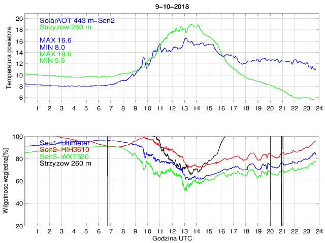Przebieg dobowy temperatury powietrza na stacji SolarAOT (443 m) i dolnej stacji w Strzyżowie (260 m) oraz wilgotności powietrza mierzonej na stacji SolarAOT dwoma różnymi czujnikami. Różnica temperatur pomiędzy dolną i górną stacją umożliwia określenie stratyfikacji najniższej warstwy granicznej.