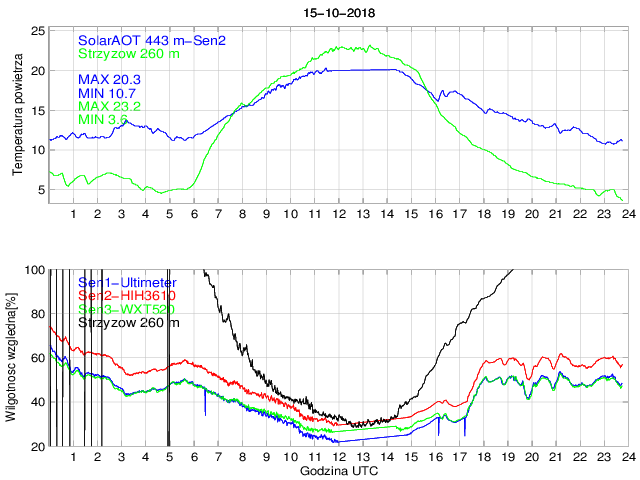 Przebieg dobowy temperatury powietrza na stacji SolarAOT (443 m) i dolnej stacji w Strzyżowie (260 m) oraz wilgotności powietrza mierzonej na stacji SolarAOT dwoma różnymi czujnikami. Różnica temperatur pomiędzy dolną i górną stacją umożliwia określenie stratyfikacji najniższej warstwy granicznej.
