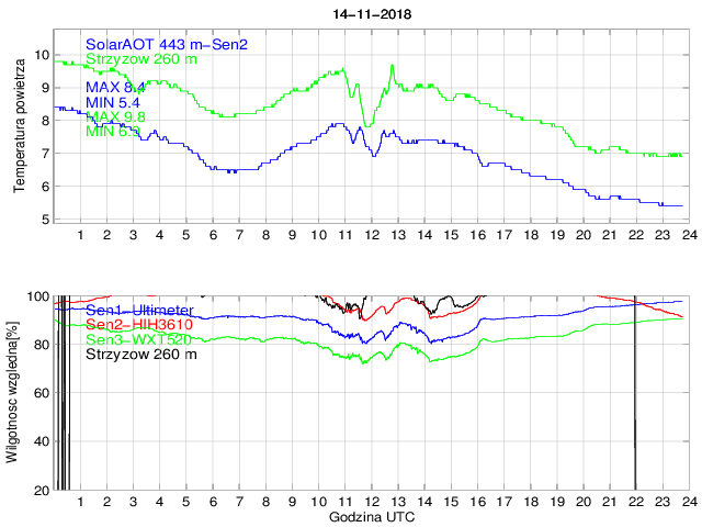 Przebieg dobowy temperatury powietrza na stacji SolarAOT (443 m) i dolnej stacji w Strzyżowie (260 m) oraz wilgotności powietrza mierzonej na stacji SolarAOT dwoma różnymi czujnikami. Różnica temperatur pomiędzy dolną i górną stacją umożliwia określenie stratyfikacji najniższej warstwy granicznej.