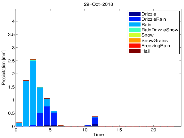 Przebieg dobowy sumy opadu z podziałem na typy hydrometeorów na podstawie pomiarów Disdrometrem OTT Parsivel.